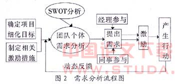需求分析的系列流程可以参照图2所示。在提出项目总体目标和相关激激励措施后,团队个体首先可用SWOT分析方法(优势、劣势、机会、威胁分析法)进行需求分析,然后在项目经理和同事共同参与的情况下提出合理的需求,在需求与行动之间就有了激励的空间。