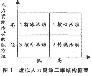 在构建虚拟人力资源结构框架时,我们可以用两个尺度来衡量人力资源活动。第一个是价值尺度,通过它可将人力资源活动界定在高价值和低价值这一范围内。高价值是指对达到组织目标有直接作用的活动,低价值是指事务性的管理活动。第二个是独特性尺度,通过它可将人力资源活动界定在高独特性和低独特性这一范围内。高独特性是指对组织来说是非常特殊的活动,低独特性是指日常的活动。如果以价值为横坐标,以独特性为纵坐标,则可构筑虚拟人力资源的二维结构框架,见图1。